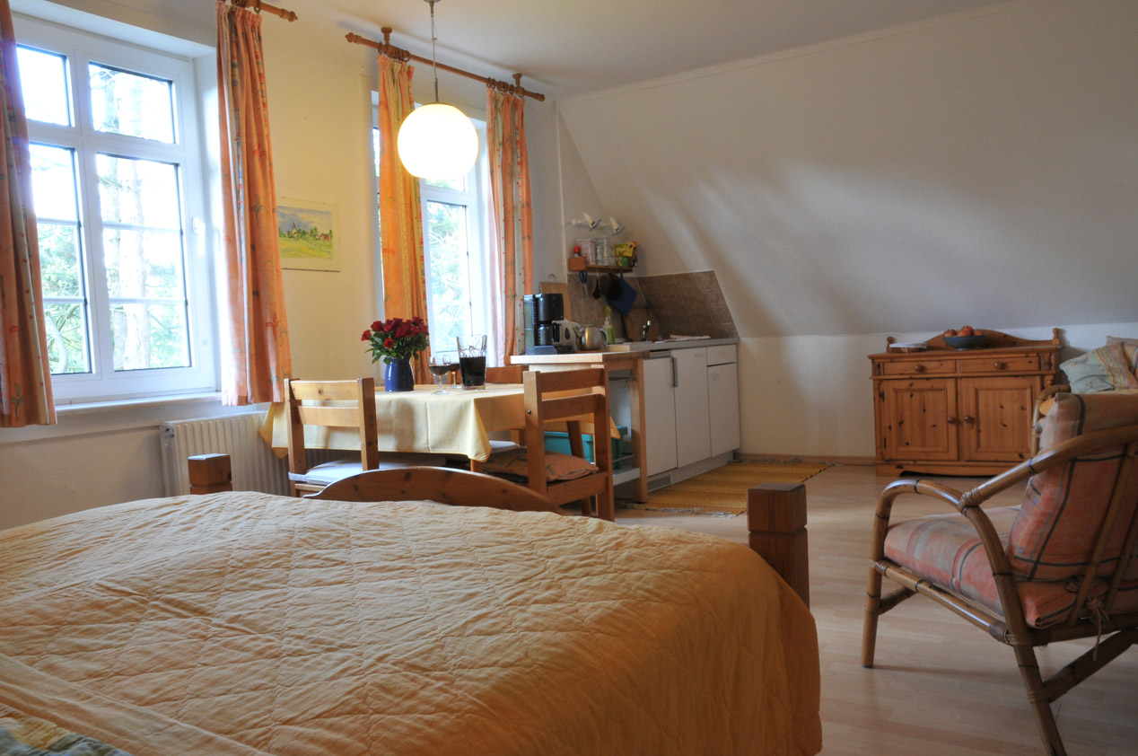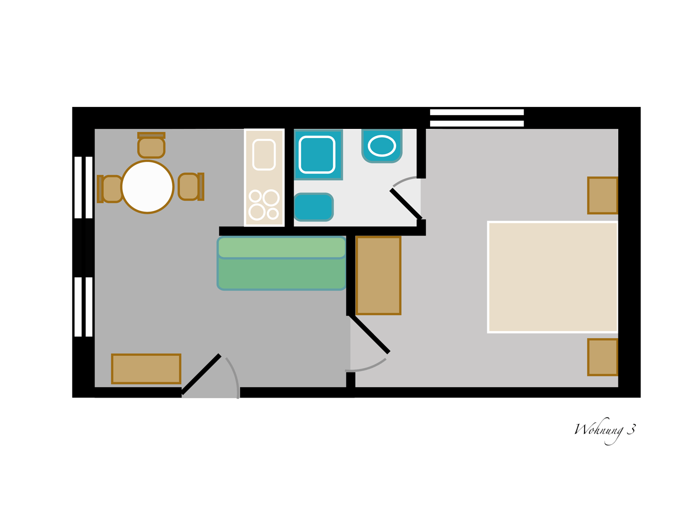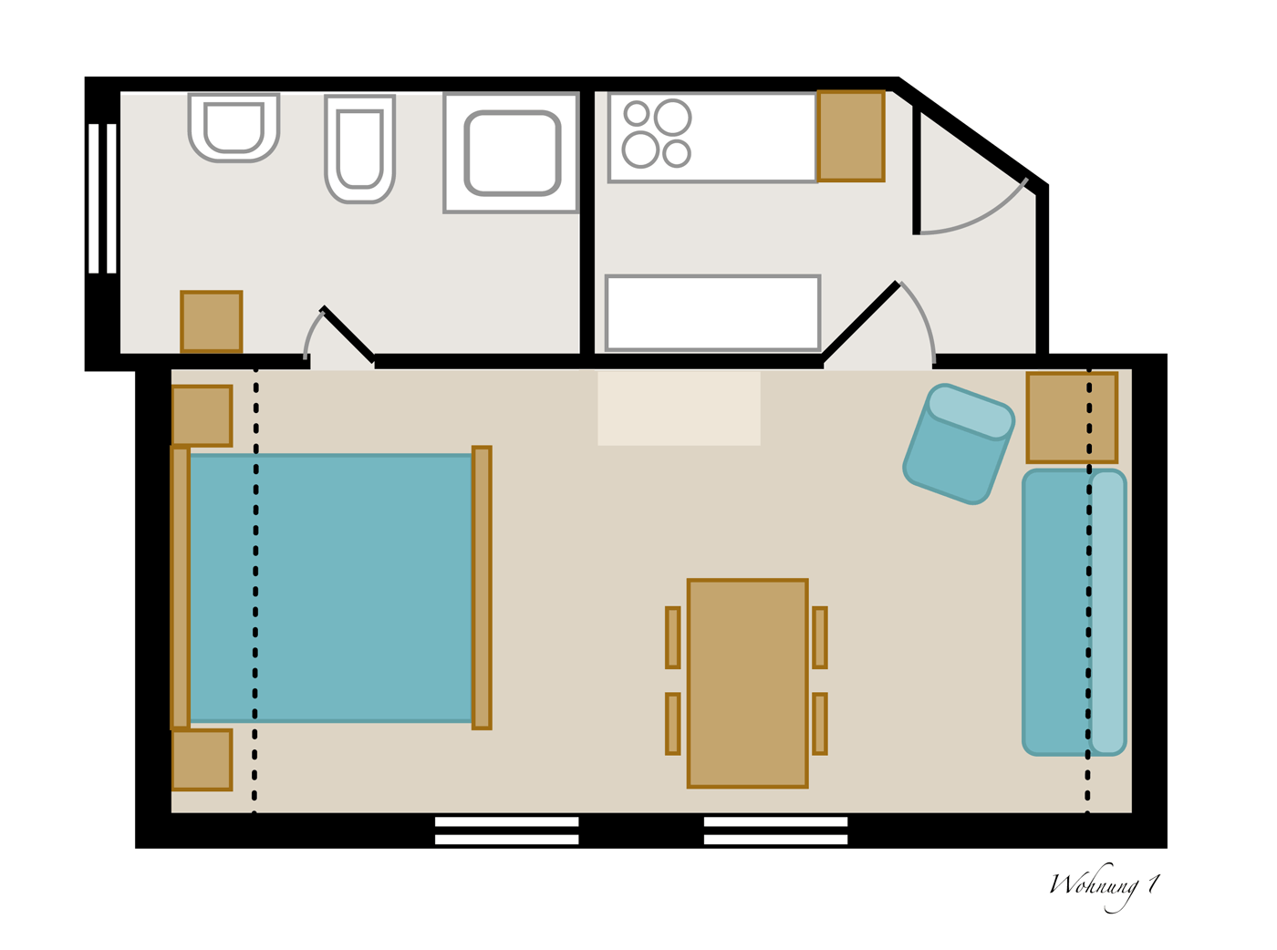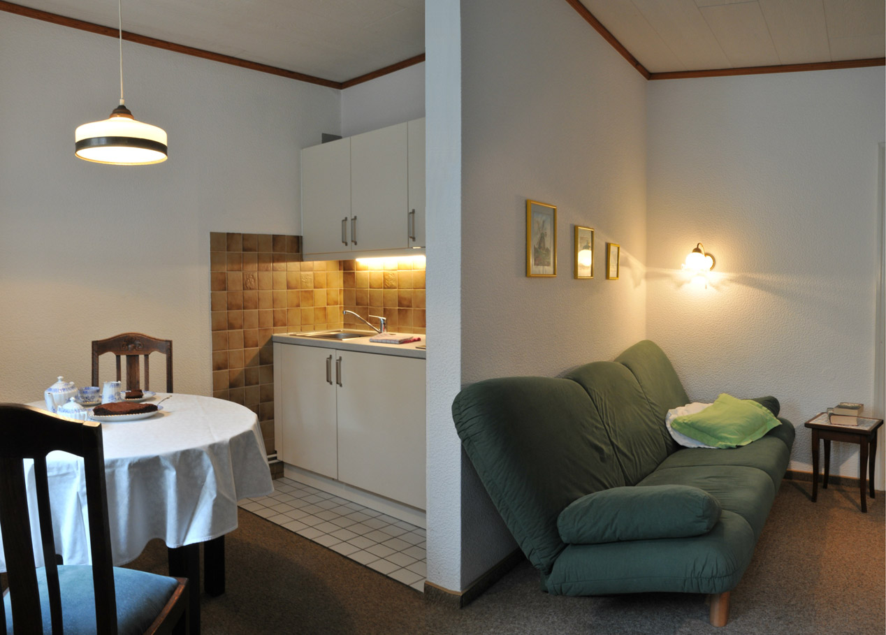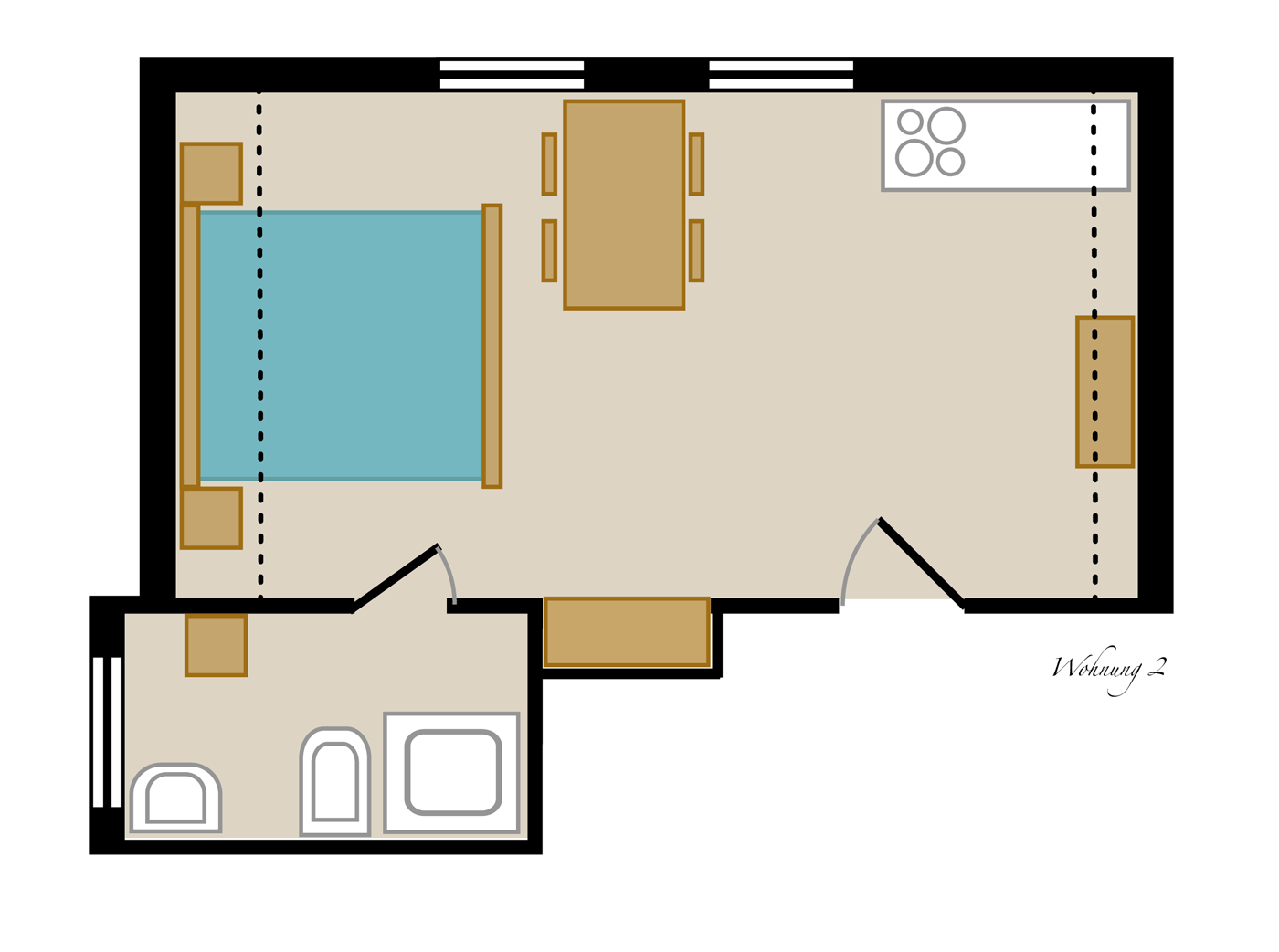 Diese Wohnung besteht aus einem Schlafzimmer mit Doppelbett, Bad (DU, WC, WB) und einem Wohnraum mit einer Kochnische.