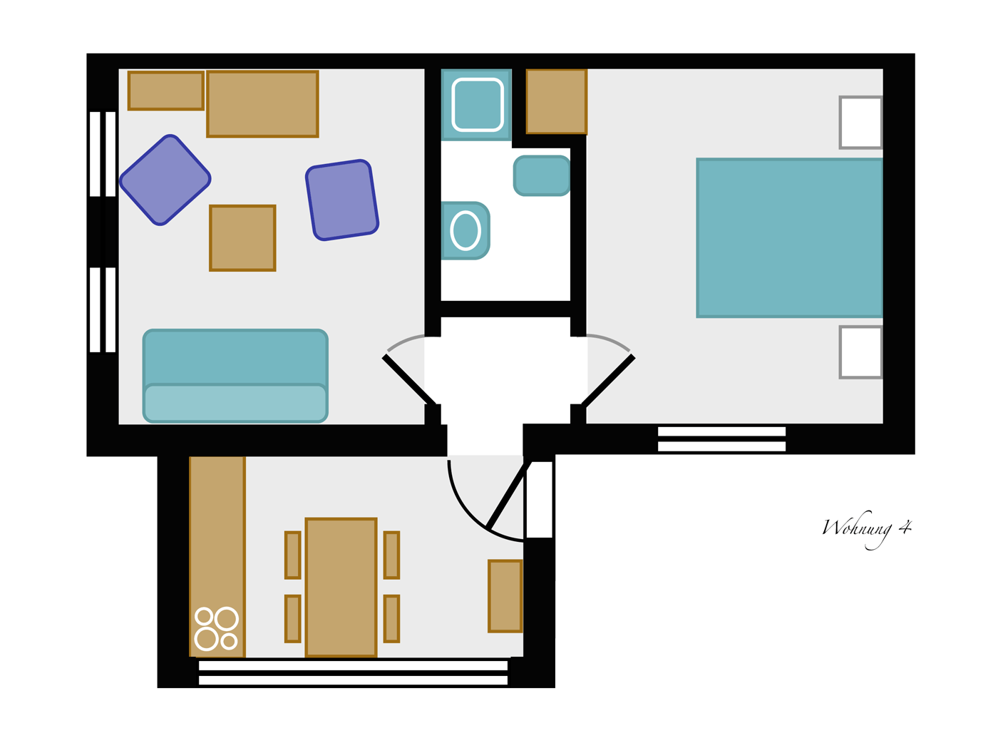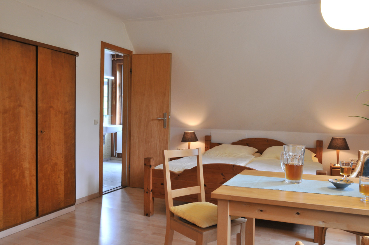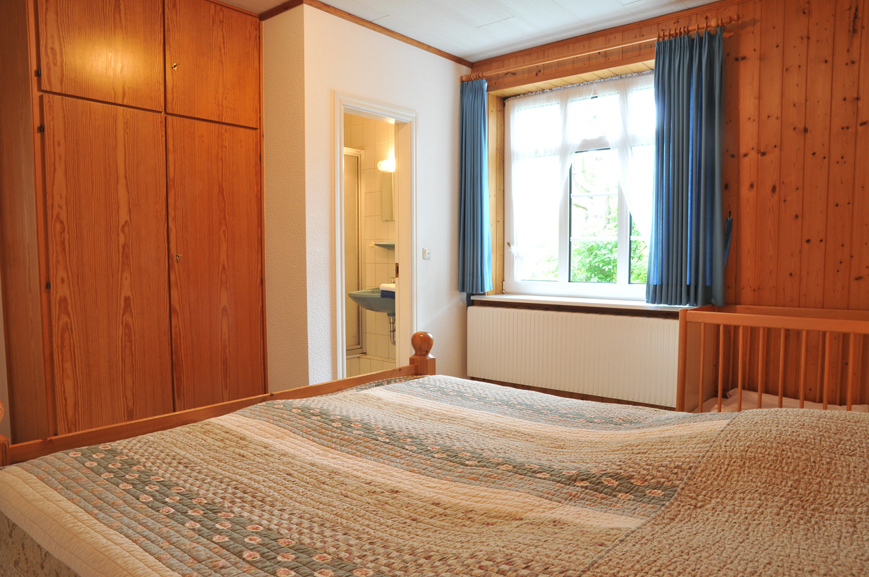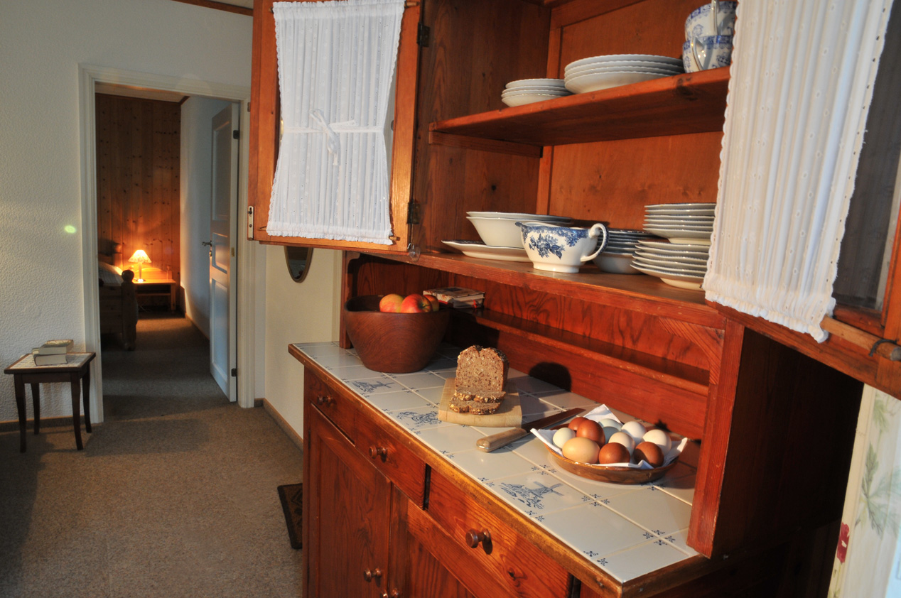 Diese Wohnung besteht aus einem Schlafzimmer mit Doppelbett, einem Wohnzimmer, Küche mit Sitzplatz, Bad (DU, WC, WB) und Terrasse. Ein separater Eingang an der Südseite sorgt für Ruhe und eine gewisse Abgeschiedenheit.